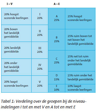 Bijgaande figuur laat zien hoe de nieuwe niveauverdeling staat t.o.v. de oude (A-E)
